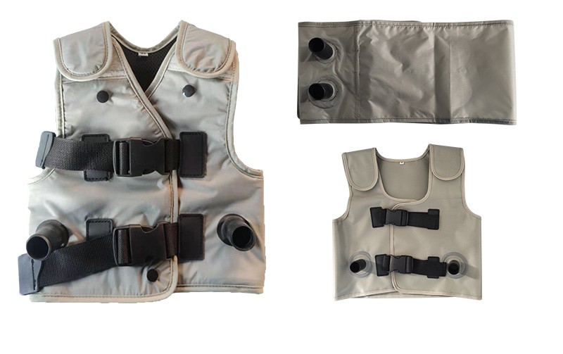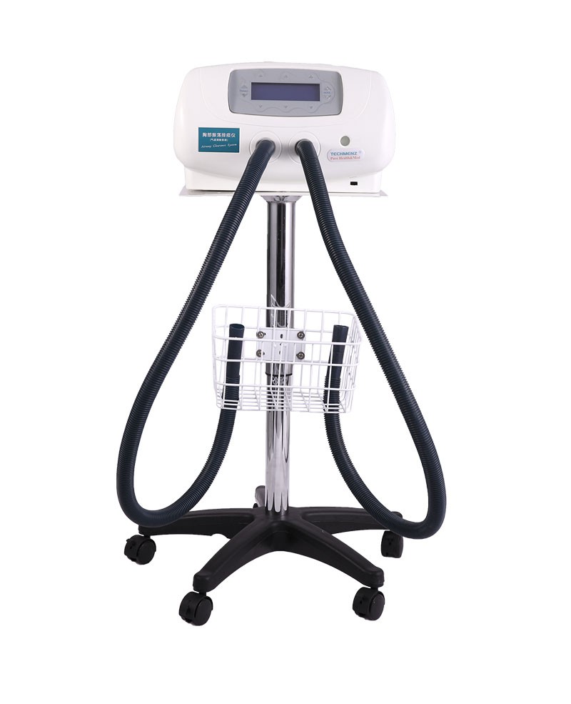 通過(guò)模擬正常生理咳嗽的原理,將患者所穿專用充氣背心用導(dǎo)氣軟管連接到高速脈沖泵上,并快速地充氣和放氣,使患者胸壁發(fā)生有規(guī)律的舒張運(yùn)動(dòng),患者氣道和肺部發(fā)生自主的震顫氣流和定向引流力,促使呼吸道粘液及各個(gè)肺葉深部代謝物松弛,液化、脫落;并在定向引流力的作用下將已液化脫落的代謝物按照選擇的方向(如細(xì)支氣管→支氣管→氣管)排出體外。